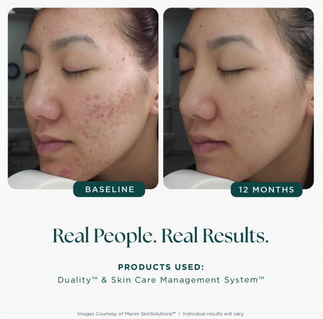 Serious acne control and dramatic benefits to aging skin, in one amazing product. Its unique dual chamber dispensing solution combines some of the most proven, yet previously incompatible, technologies in one product. The maximum allowed percentage of ultra-micronized benzoyl peroxide, highly concentrated all-trans-retinol, green tea extract, anti-aging peptides, advanced hydrators and antioxidants deliver unparalleled results in an easy to use solution. Age Intervention Duality addresses even the most stubborn adult acne while simultaneously minimizing the appearance of fine lines and wrinkles. Independent Study Results: A 3-month independent physician study using the Skin Care Management System™ and Duality MD™ on 21 subjects ages 20-29. Conducted by Jaggi Rao, MD Board Certified Dermatologist, FRCPC, Professor of Medicine, University of Alberta. Subject Assessment Results: 100% of subjects experienced a reduction in acne lesion counts. Improvement was statistically significant by week 4 and continued to improve through completion. 64% average lesion count reduction (range 36% to 78%). 100% of subjects experienced significant improvement in skin quality by blinded photographic review. High subject satisfaction with no reported irritation or excessive drying.